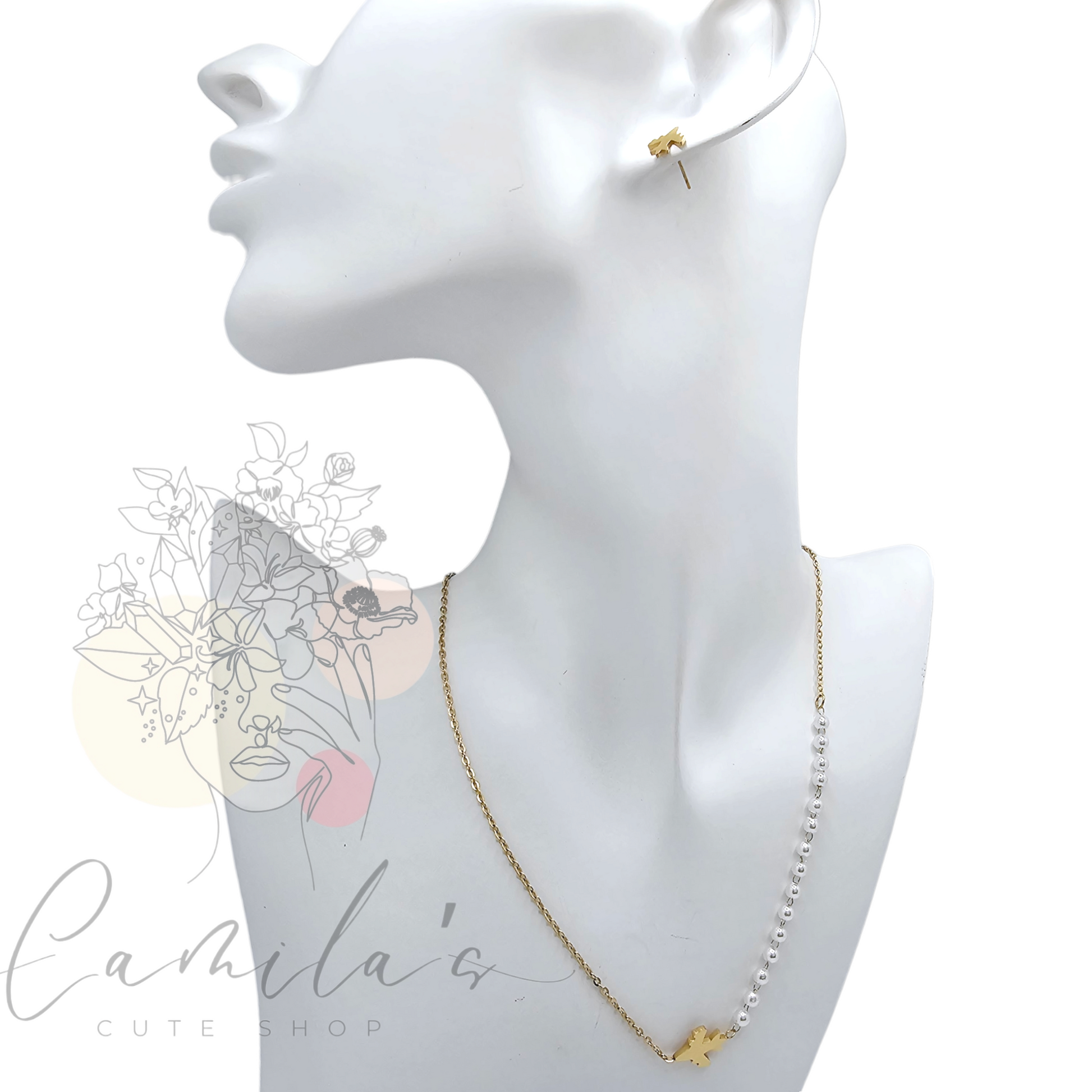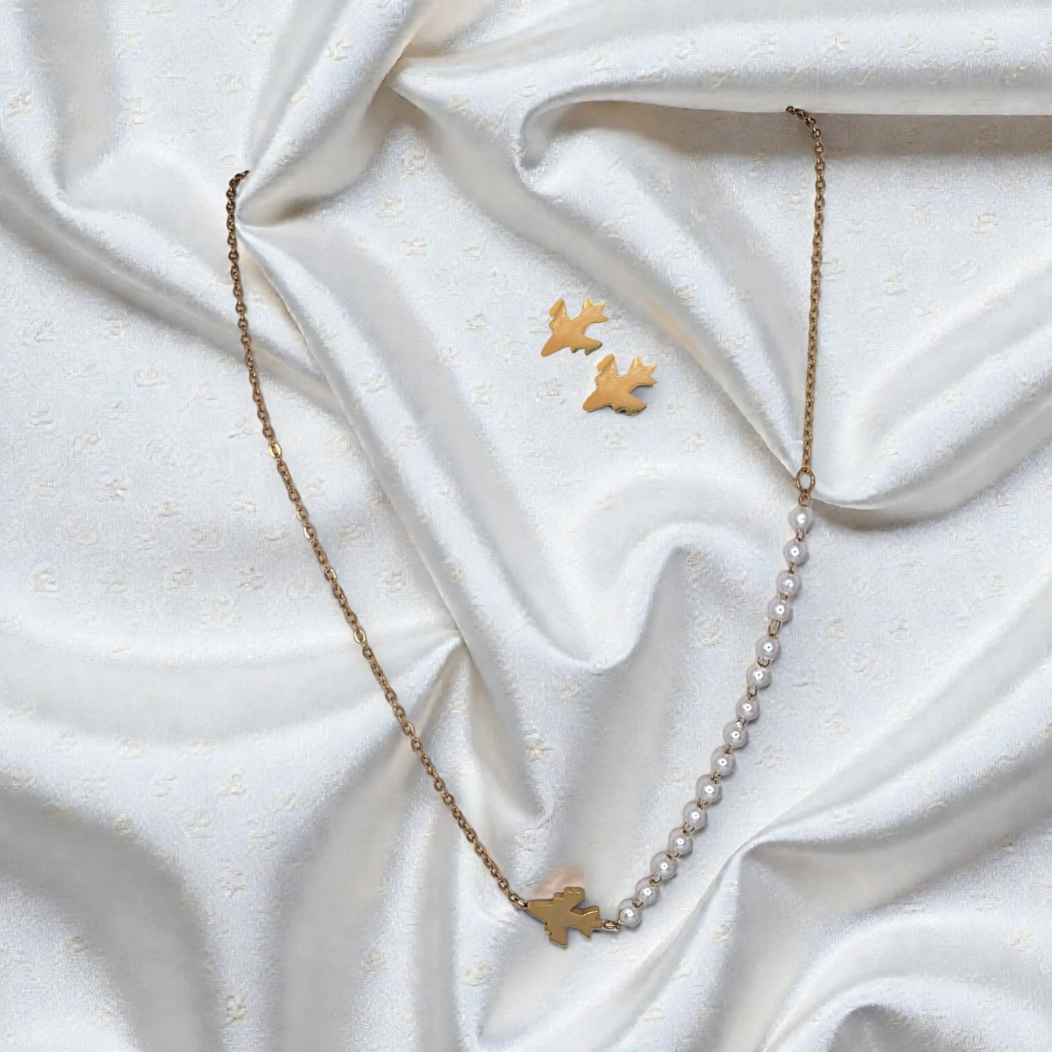 This elegant and sophisticated set draws inspiration from the freedom of travel and the beauty of subtle details. The necklace features an asymmetrical design that blends a delicate chain with a strand of luminous pearls, finished with a refined airplane charm symbolizing dreams, adventure, and new beginnings.